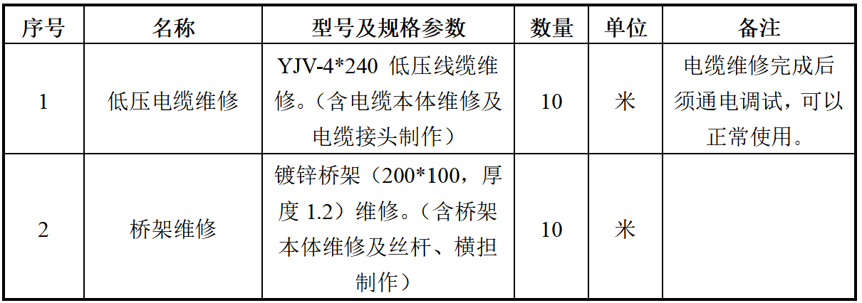 4、服务要求:含原有损坏的电线及接头、桥架拆除,新电缆、新桥架安装,以及新电缆通电调试等工作。报价中需要包括含人工费、主材费、辅材费、机械费、运输费、成品保护费、调试费以及确保供电电缆及桥架正常使用的一切费用。质保期至少1年。注意:中标方同时需要负责桥架丝杆、横担制安工作,确保其正常工作,该部分费用已包含在总报价中,不再另行计费。